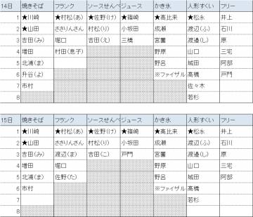 品目 購入店 住所 電話番号 焼そば麺 株式会社 丸紀 (まるき) 神奈川県横浜市港北区新吉田東7-27-10 045-543-4289 肉のハナマサ 中野区中央3-24-15 03-5348-2502 つくね 生産者直売のれんかい 東京都台東区雷門1-2-5 03-5827-7530 氷 城西産業 杉並区天沼3-15-16 03-3391-7849 シロップ 合資会社 弥生産業(氷販売店) 三重県四日市市東富田町22-13 059-365-0471 シロップ お祭り問屋の岸ゴムキッシーズ株式会社 愛知県名古屋市西区新道2-4-15 052-563-4681 氷シロップ製造元 株式会社ハニー 宮崎県宮崎市高岡町花見1720-5 0985-82-5582 カルピス ワインと地酒の店 かたやま 愛媛県松山市東石井 3-11-5 089-958-6786 ラムネ A-プライス高井戸店 杉並区高井戸東4-13-1 03-5336-0362 ジュース OKストア中杉 中野区鷺宮3-47-7 03-3336-7211 せんべい 株式会社辰屋 愛知県蒲郡市松原町19-6